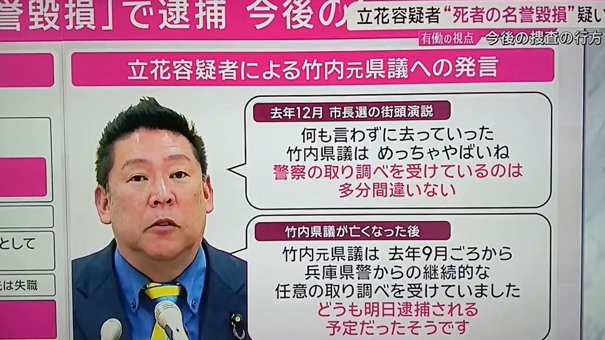 有働さん「立花容疑者の発信を、そのまま拡散した人もいます、名誉毀損の罪に問われますか?」 若狭弁護士「はい、拡散する際に自ら書き込んで、竹内さんは逮捕される予定だったとか、違いないとか、自分の言葉を加えて発信してれば同じ様に名誉毀損罪に問われる可能性があります」 東〇原も逮捕しろ