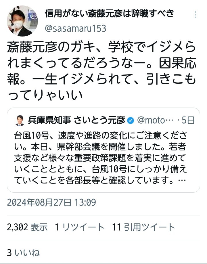 そうだそうだ 斎藤元彦は兵庫を破壊する一翼を担っている自覚があるのか! 今すぐ辞めろ! #斎藤元彦法令違反 #斎藤元彦信者は恥ずかしい #斎藤元彦第三者委員会費用4856万お前が払え #中島由美子を許さない x.com/tktunikr/statu…