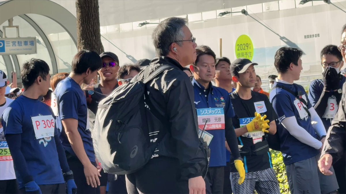 斎藤知事のスタート前の入念なストレッチからスタートまでです✨ 知事は日頃の運動でスタイルを維持されてるからスポーティで格好いいですね☺️ それにしても今日走られるとは思わなかった〜 #さいとう知事ありがとう #さいとう知事がんばれ