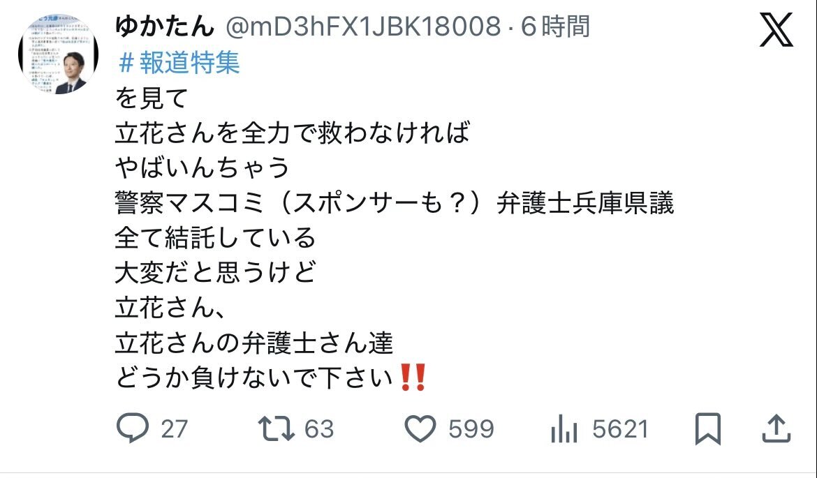 しかし残念ながら驚くことに、「そもそも竹内さんがデマを流したから」という意見が根強く多い。ウソやデマは野を焼く炎のように広まるのが早いのにな。まだそういう情報の人が多いのだね。ショックですわ。 #斎藤知事でなければ失われなかった命がある