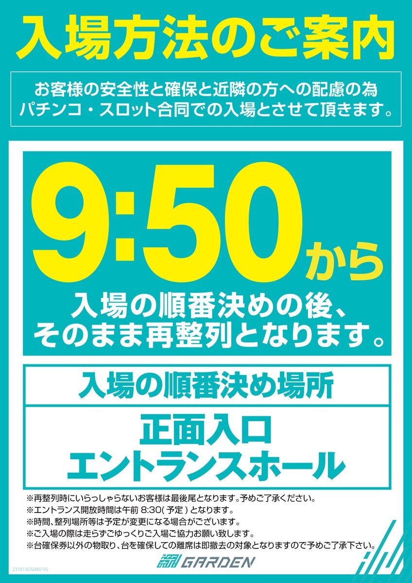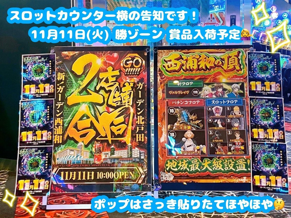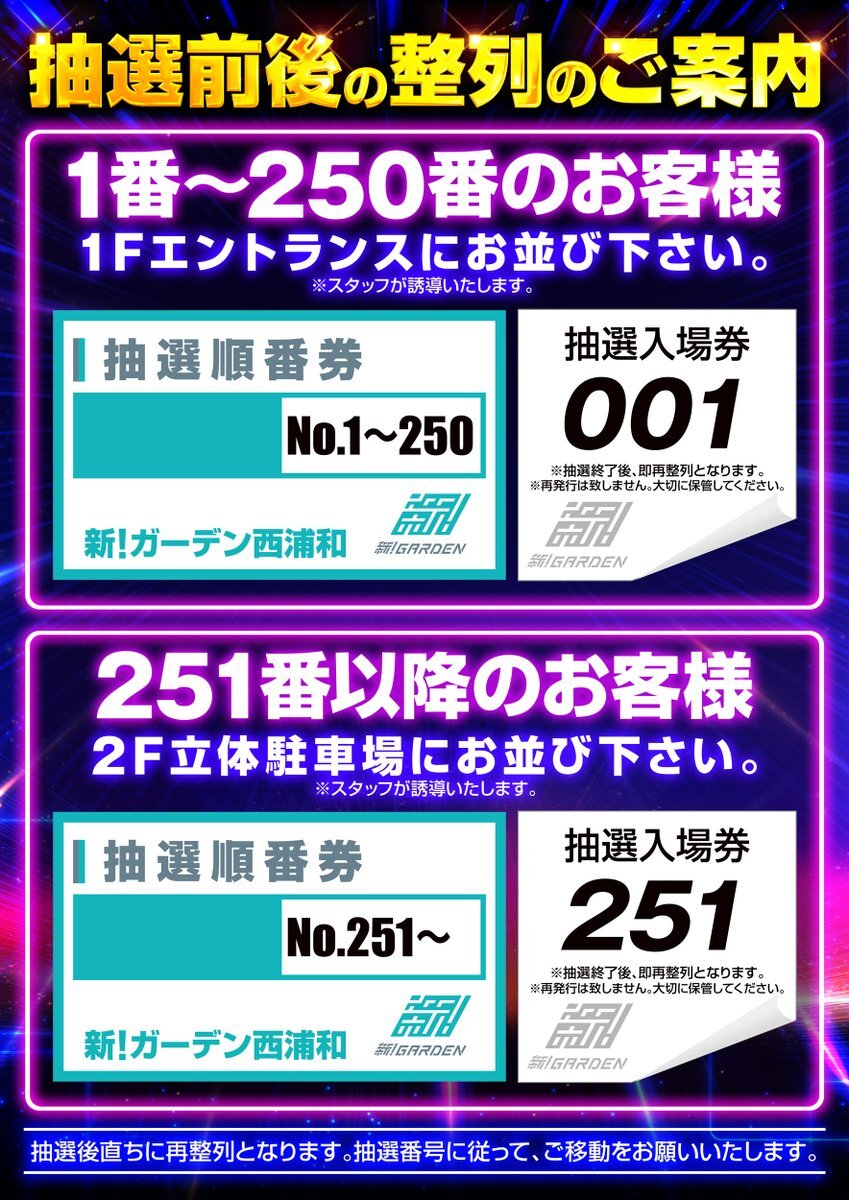 \おはようございます🌤/ #新ガーデン西浦和 から大切なお知らせ⚠️ 【本日11月14日(金)の入場順番決めのご案内】 ①締め切り時間 →『9時50分』となります。 ②集合場所 →エントランス喫煙所前 ③打ち切り →ございません。 pic.x.com/B7QmRJRYrD