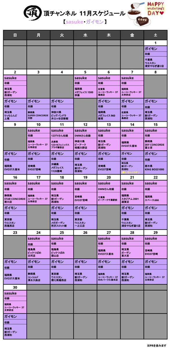 明日11/12(水)はガイモンが埼玉県の新!ガーデン西浦和さんにて来店収録です!! ぜひ遊びに来て下さい💪 ステッカーお写真等いつでもお声がけください📸 <PR> #頂チャンネル #新ガーデン西浦和 x.com/itadaki_ch/sta…