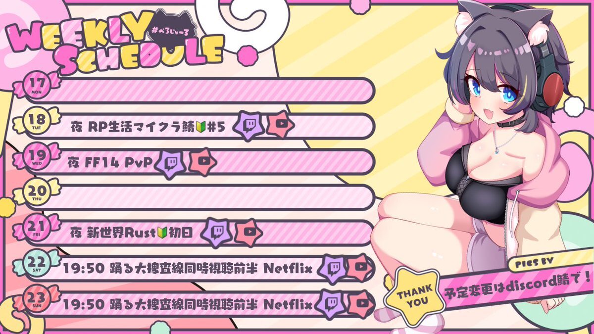 #ぺろじゅーる でき! 火曜日は久々マイクラでレアポップアイドルがんばります🫶 金曜日から #新世界Rust がスタート! そして土日はNetflixでドラマの踊る大捜査線一気見やるどーー٩(๑>ᴗ<๑)۶ pic.x.com/vtB33LPTV8