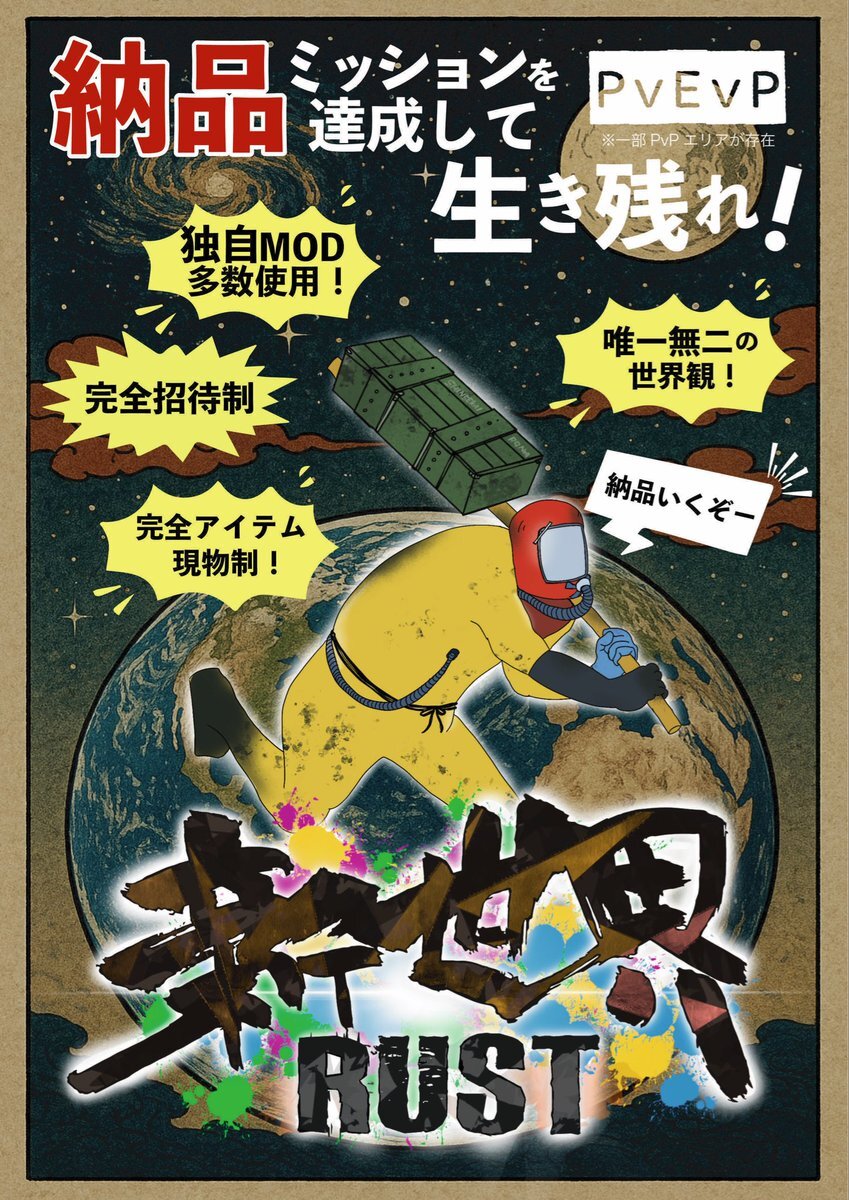 【告知】 🌏11/21〜11/30 開催🌏 ストリーマー・クリエイター限定の完全招待制サーバー! 今回のメインテーマは―― 「アイテム納品」?! 📦 独自MODを多数使用した、 "他にはない“新たな世界。 それが―― 新世界Rust ロゴ・紹介画像制作:ちんご(@Sin5KK )さん!BIG TY🥰 #新世界Rust