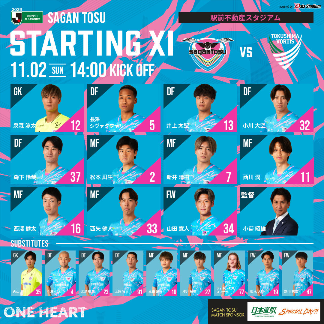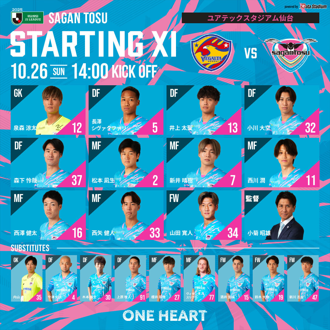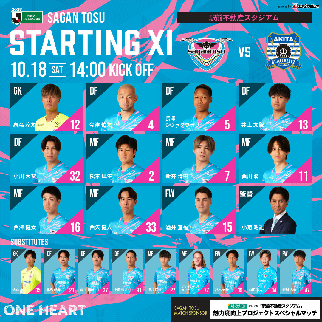 🔥スタメン発表🔥 2025明治安田J2リーグ 第33節 #サガン鳥栖 🆚 #ブラウブリッツ秋田 GK #泉森涼太 DF #今津佑太 #長澤シヴァタファリ #井上太聖 #小川大空 MF #松本凪生 #新井晴樹 #西川潤 #西澤健太 #西矢健人 FW #酒井宣福 #sagantosu #ONEHEART #Jリーグ #Jleague pic.x.com/Q0CA82jXyS