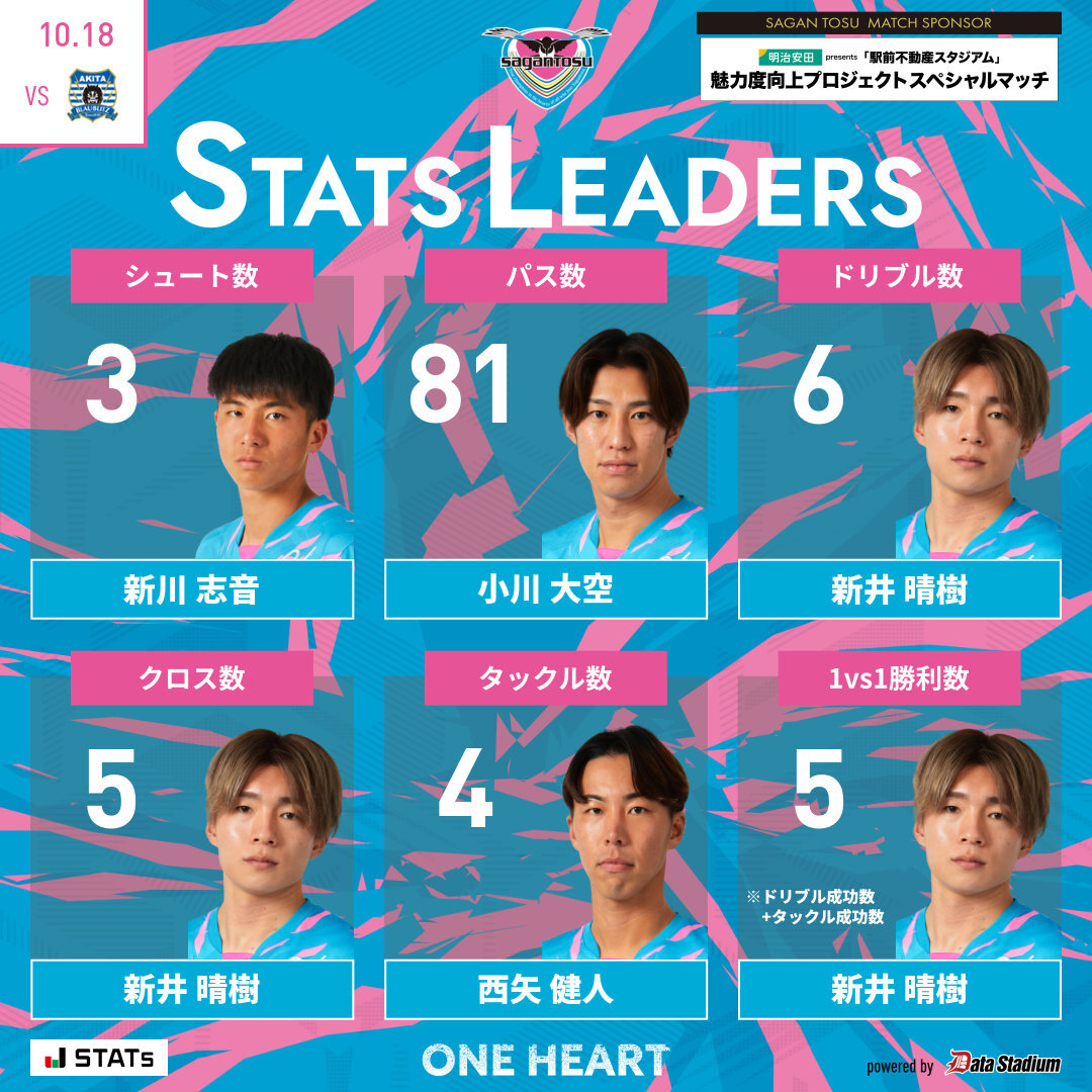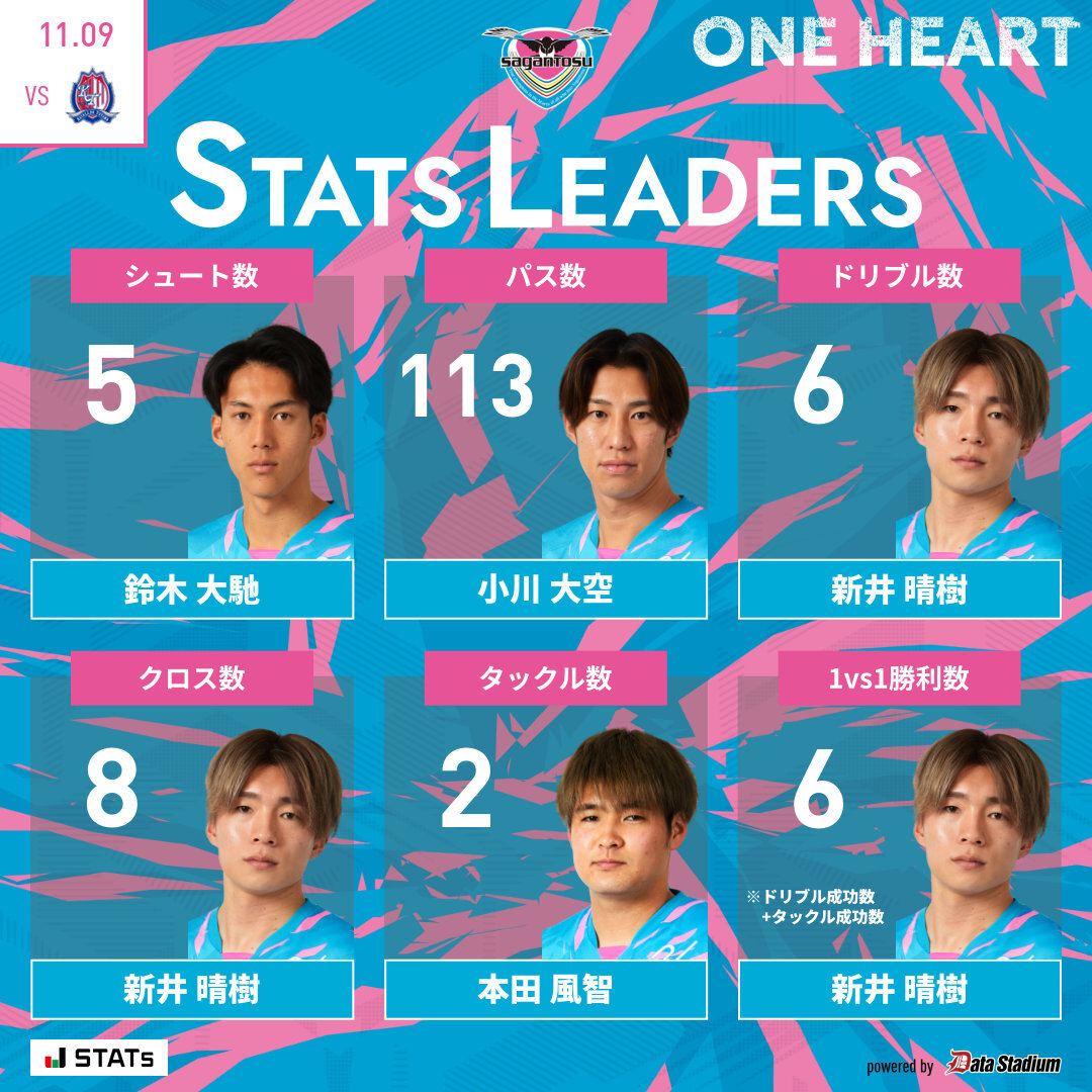 👑本日のスタッツリーダー シュート数: #ヴィキンタススリヴカ パス数: #小川大空 ドリブル数: #新井晴樹 クロス数: #新井晴樹 タックル数: #新川志音 1vs1勝利数: #新井晴樹 #サガン鳥栖 #sagantosu #ONEHEART #Jリーグ #Jleague