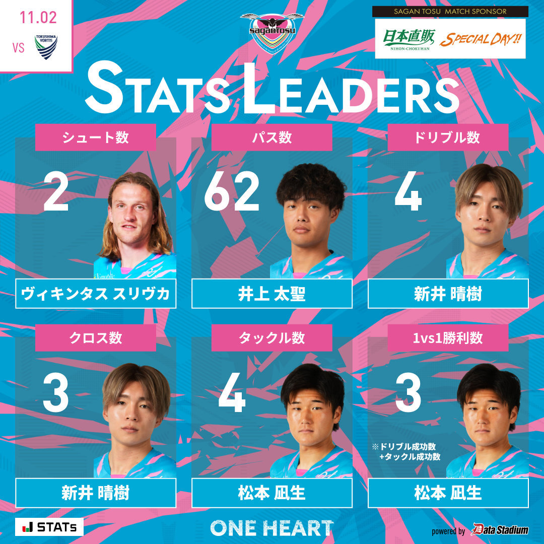 👑本日のスタッツリーダー シュート数: #ヴィキンタススリヴカ パス数: #小川大空 ドリブル数: #新井晴樹 クロス数: #新井晴樹 タックル数: #新川志音 1vs1勝利数: #新井晴樹 #サガン鳥栖 #sagantosu #ONEHEART #Jリーグ #Jleague pic.x.com/7MVkMPqvjn