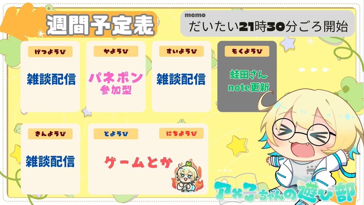 ざっくり配信スケジュールです だいたい毎週こんなかんじ! 月:雑談配信 火:パネポン参加型 水:雑談配信 木:カエルダさんnote更新 金:雑談配信 土日:週替わり 開始時間は21時30分くらい👀 突発でお昼の作業配信や深夜配信などあり! #新人Vtuberお探しですか pic.x.com/MR56sLaPE1