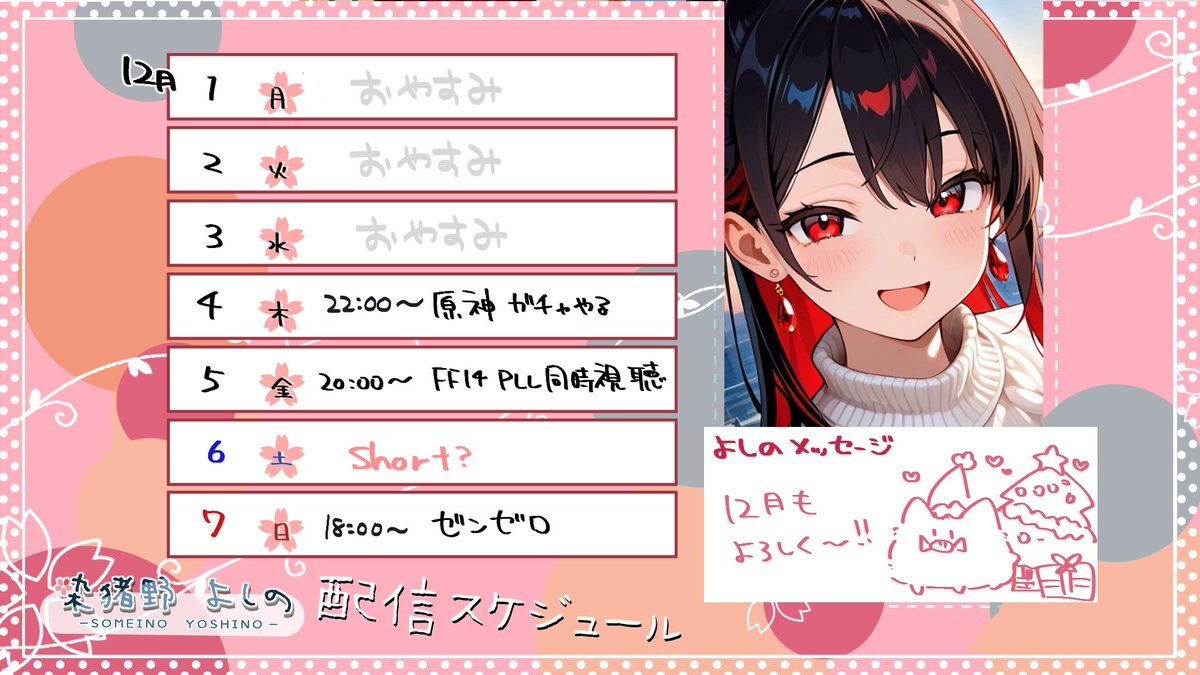 🌸12/1(月)~ スケジュール🌸 今週は色んなことやるよ~~~~!!!! ただ月初にちょっとバタつくので、 週の前半はおやすみ多めに させてください…!🙏 それじゃあ1週間よろしくね!!!✨️ #新人Vtuberお探しですか pic.x.com/FYeAiFCPRZ