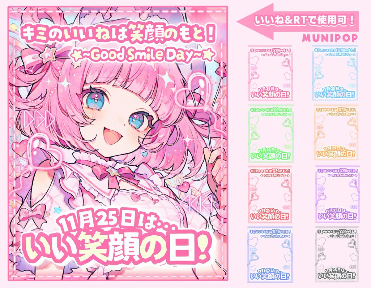 ˚.✧✨💖 フリー素材 💖✨✧. ˚ ⋰ 11月25日は #いいえがおの日 😆✨ ⋱ ⚠️いいね🩷&RT🔄両方で使用OK❕ カラバリ8色❣️リプ欄から保存どうぞ💫 #Vtuber素材 #おはようVtuber素材 #Vライバー素材 #IRIAM素材 #Vtuberフリー素材 #むにフリー素材