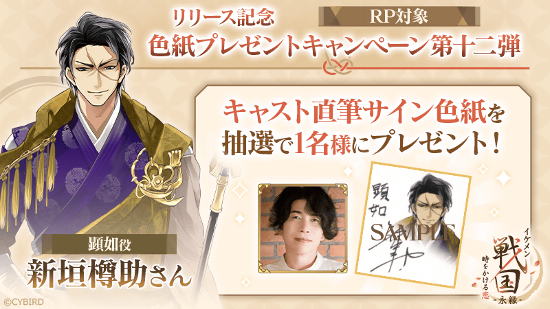 ⚔リリース記念色紙プレゼントキャンペーン第十二弾⚔ #イケメン戦国永縁 好評配信中! 顕如役 #新垣樽助 さん 直筆サイン色紙を1名様にプレゼント🎁 ■応募方法 ①このアカウントをフォロー ②このポストをRPで応募完了! 応募期限:9/15(月)23:59 ▼DLはこちら app.adjust.com/1pyn4f0e