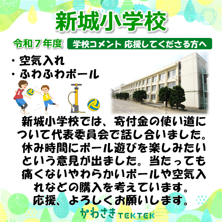 新城小学校からメッセージが届きました🦢 令和7年度、学校からのコメントをぜひご覧ください🤾 みなさま応援をよろしくお願いします💖 ●ポイント寄附の方法はかわさきTEKTEKホームページをご覧ください● #川崎市 #かわさきTEKTEK #かわてく #新城小学校 #小学校 #中学校 #応援しよう #健康 #笑顔 pic.x.com/7KnhS0yLDw