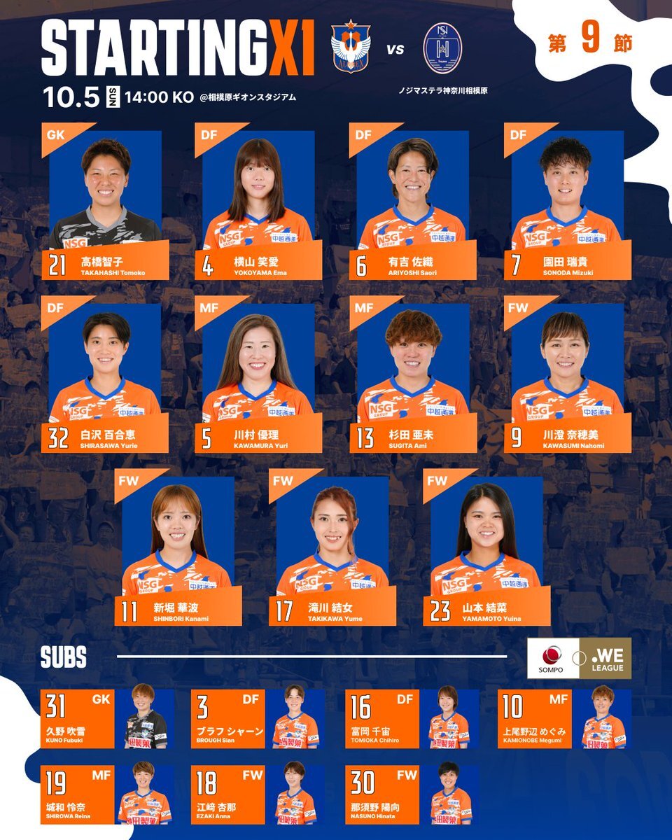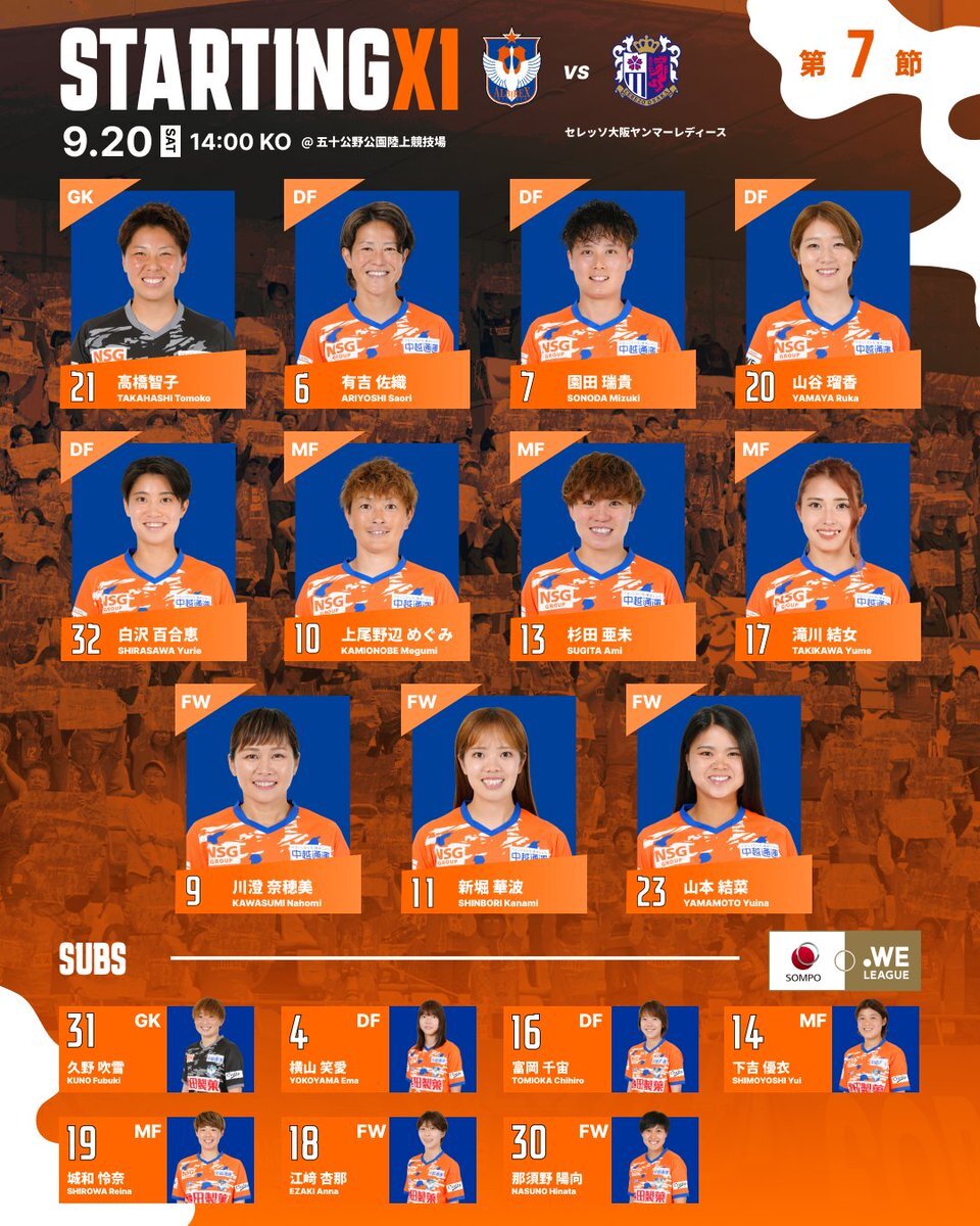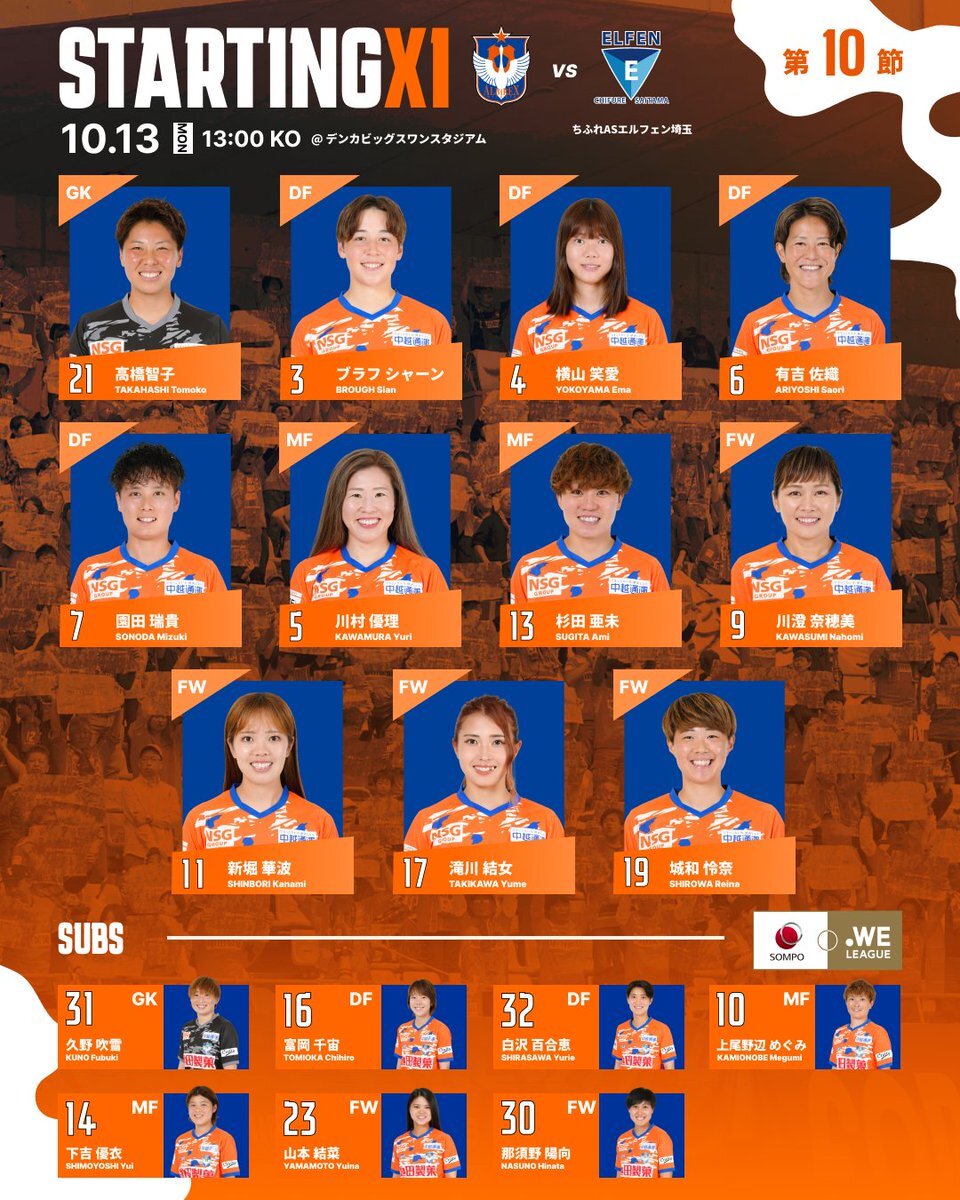 / 10/13 #EL埼玉 スターティングメンバー🔥 \ GK) 21 #高橋智子 DF) 3 #ブラフシャーン 4 #横山笑愛 6 #有吉佐織 7 #園田瑞貴  MF) 5 #川村優理 13 #杉田亜未 FW) 9 #川澄奈穂美(cap)11 #新堀華波 17 #滝川結女 19 #城和怜奈 #albirexL #albirex #WEリーグ #超えて奪う