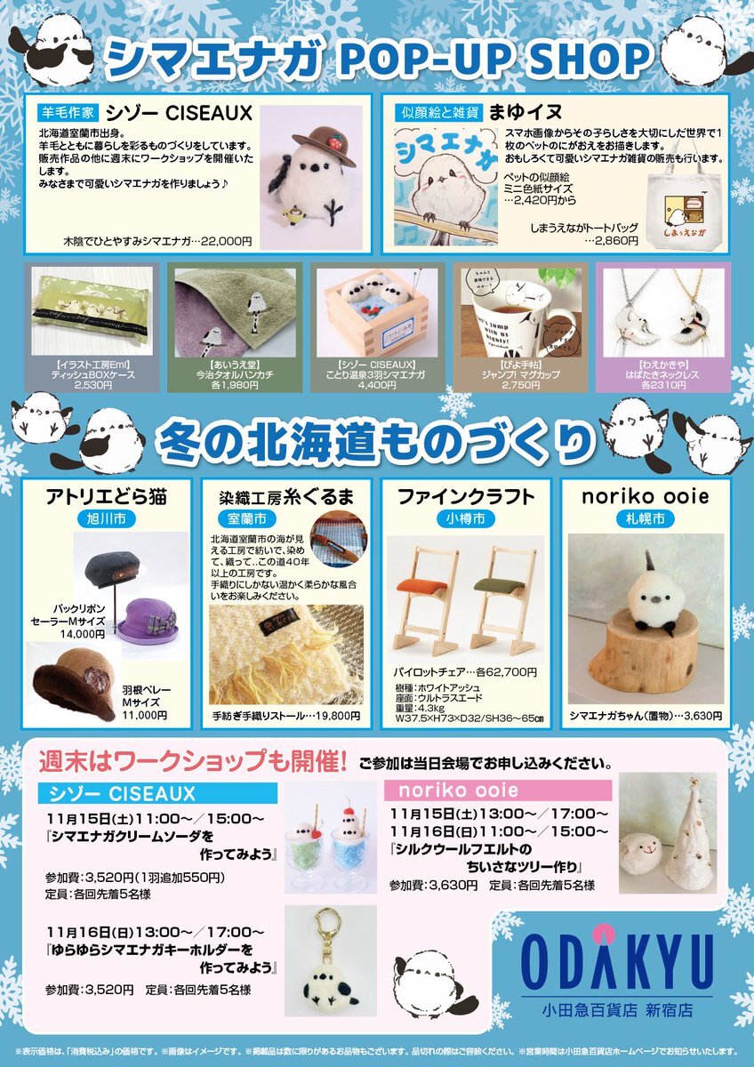 小田急百貨店新宿店7階「シマエナガPOPUP」 初日終了しましたー! 北海道作家様も楽しくて、とてもいい売り場になっています 会期は週明け11月17日㈪まで 明日も10時から20時まで新宿西口、小田急百貨店にてお待ちしていまーす! 週末は「シゾー」さんのワークショップも開催だよ! #新宿シマエナガ pic.x.com/Lzy2TwNniN