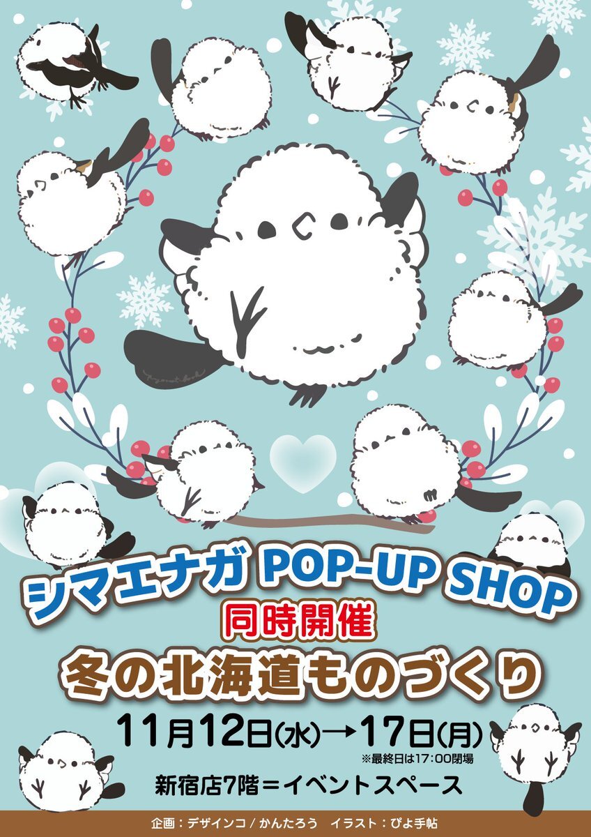 11月12日㈬から17日㈪まで小田急百貨店新宿店で「シマエナガPOPUP」を開催します シマエナガといえば! 「ぴよ手帖」さん! がメインビジュアル 会期中はワークショップも開催 併催催事は「北海道ものづくり」 北海道にちなんだ作家さんや作品が集まります 遊びにきてくださいねー #新宿シマエナガ pic.x.com/Us8lB6EEma