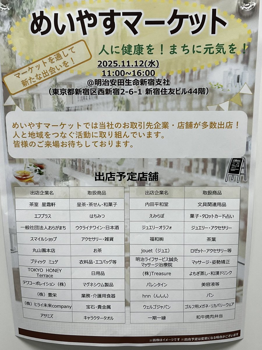 本日めいやすマーケットに出展させていただいています! 16時まで新宿住友ビル44階におりますので、 お近くにお越しの際はお立ち寄りください。 #明治安田生命 #めいやすマーケット #新宿 #新宿住友ビル #株式会社Treasure #yomogyst #ヨモギスト #ennyou #yokayo pic.x.com/tacHhSAC5j