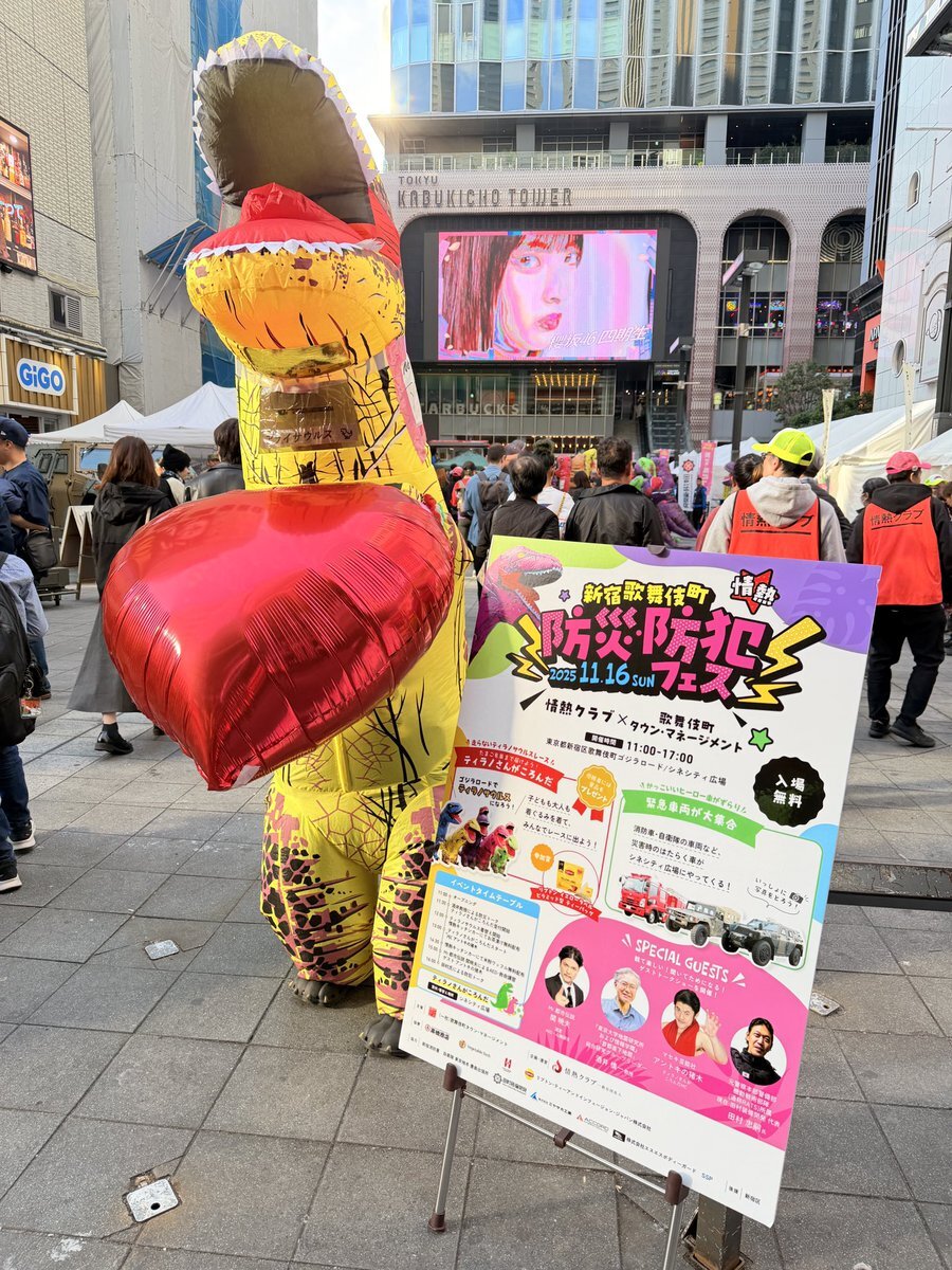 \ 本日開催‼️ / 🚨 新宿歌舞伎町 防災・防犯フェス 🚨 11:00〜17:00まで‼️ 新宿歌舞伎町 ゴジラロード/シネシティ広場 で開催しています✨ 家族で!友達と!楽しめる内容盛りだくさん👯♀️✨ みんなで歌舞伎町へGO🦖🌟 #情熱クラブ