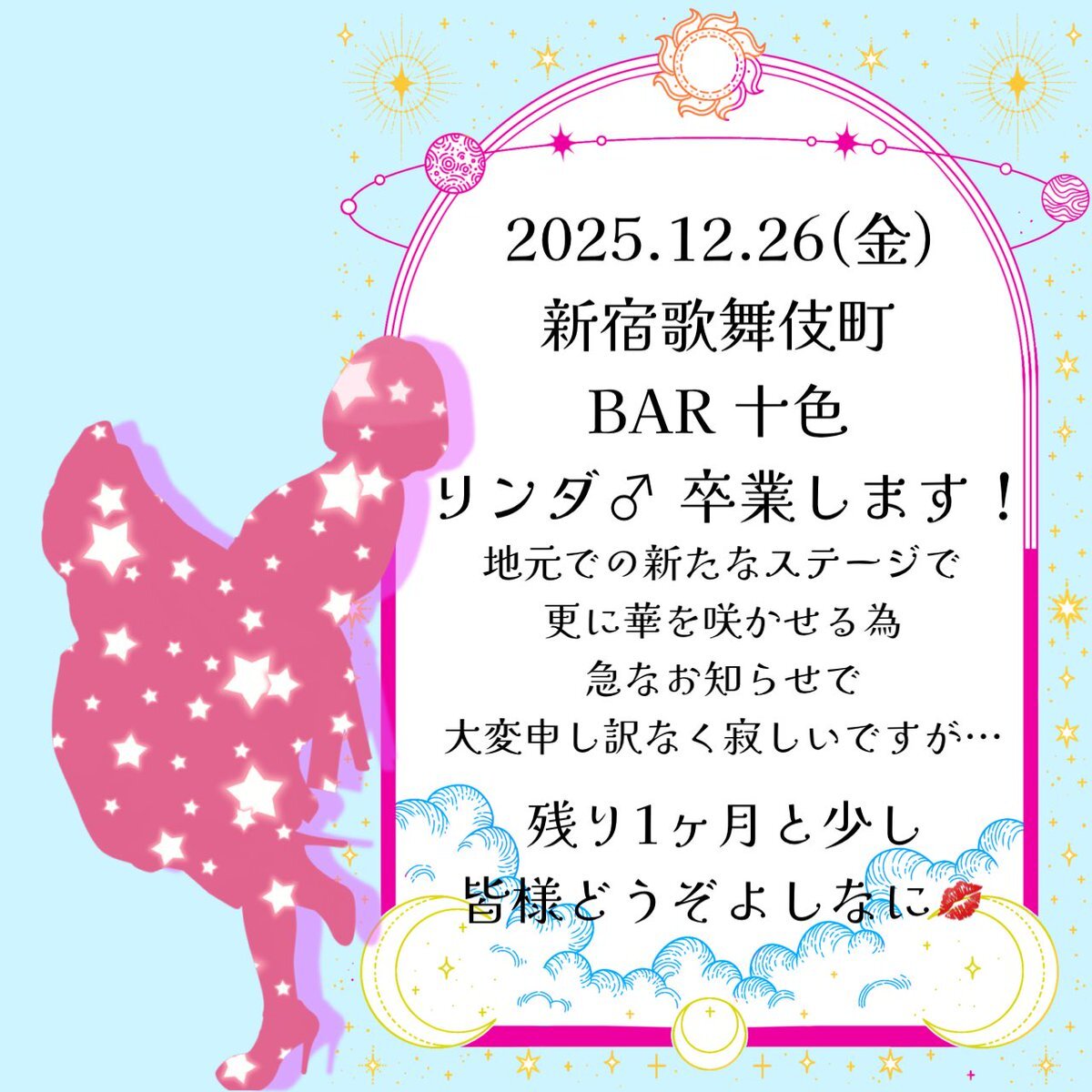 新たなステージに立つ為に 2025年12月26日(金)で 新宿歌舞伎町 BAR十色を卒業させて頂く事になりました! 寂しい気持ちはとてもありますが… 残りの期間皆様どうぞよしなに💋 諸用により今宵は21時30分から! 新宿歌舞伎町 BAR十色にて 皆様のご来店をお待ちしてるわ💋 #新宿歌舞伎町 #LGBTQ pic.x.com/wtQLgvVDEh