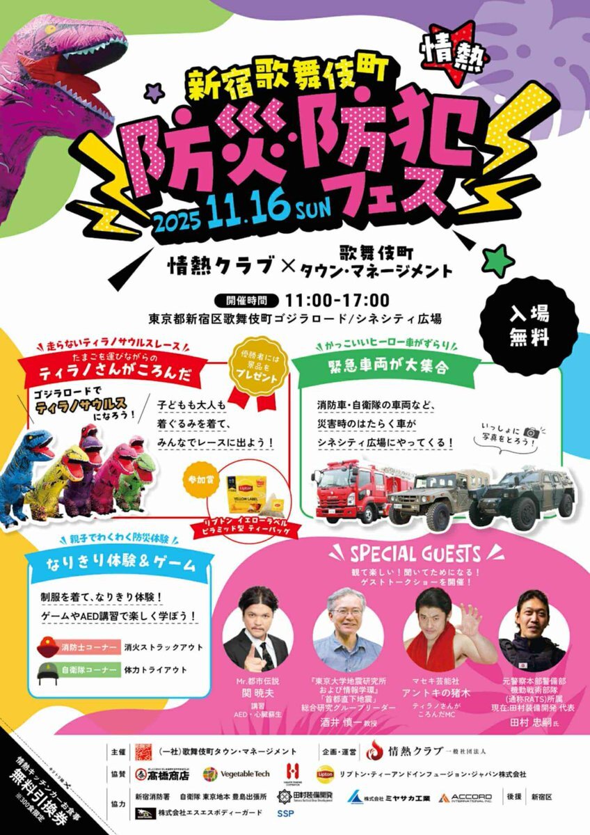 ついに明日❗️ #新宿歌舞伎町 にて✨ 防災・防犯フェス🔥開幕🔥 #ティラノサウルスレース 🦖 #緊急車両 #起震車 もやってくる! 無料だったら参加しないともったいない❣️スペシャルゲストも🔥 是非ご家族でご参加ください☺️✨ #関暁夫 さん #情熱クラブ一般社団法人 #情熱キッチンカー #無料 x.com/SEKIELBERG/sta…