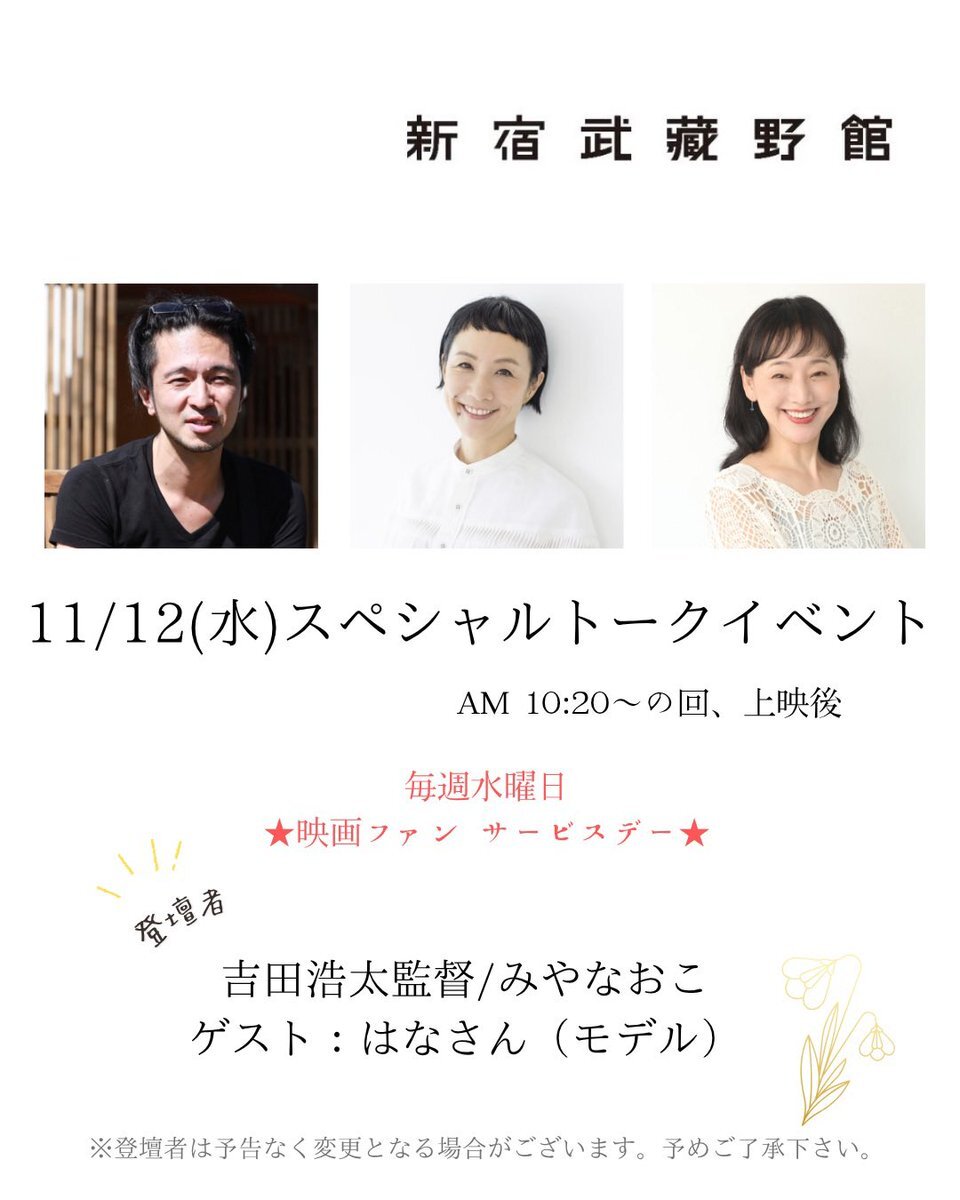 🌟映画ファン サービスデー🌟 11/12(水)のトークイベントは、#スノードロップ チームです😊 #みやなおこ さん、#はな さん、吉田監督3人のトークイベントです! お楽しみに〜🙌 #新宿武蔵野館 でお待ちしております✨ 🎫⬇️ musashino.cineticket.jp/mk/theater/shi… pic.x.com/nmLSuaCsBX