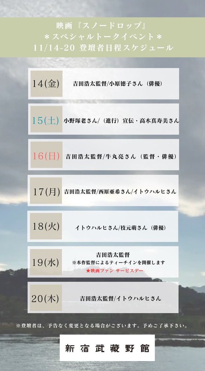 映画「スノードロップ」 6週目イベントゲスト決定致しました! 14日(金)吉田監督、小原徳子さん(俳優) 15日(土)小野塚老、進行:高木(宣伝) 16日(日)吉田監督、牛丸亮さん(監督・俳優) 17日(月)吉田監督、西原亜希、イトウハルヒ ↓続く