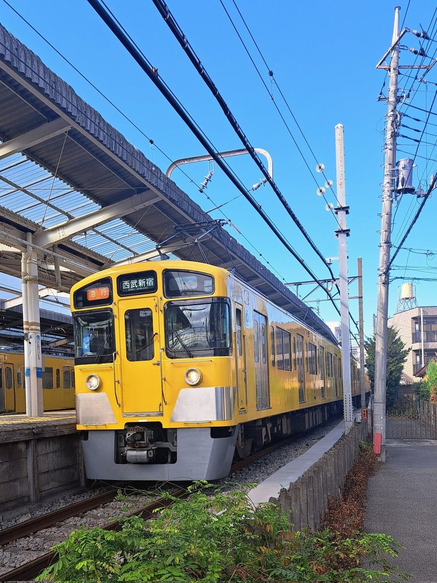 スマホで散歩鉄 黄色い電車を追う 2025年11月19日(水) 10時39分 新宿線 小平駅 2000系2463編成(2輌)+2089編成(8輌) 前パン菱形パンタグラフ 2636レ 急行 西武新宿駅行 #西武鉄道 #新宿線 #2000系 pic.x.com/kKr1uIcA9o