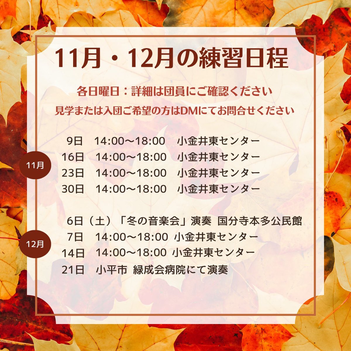 11・12月の練習日程になります 現在団員募集中。 一緒に音楽を楽しみませんか。 練習参加が可能であれば市外の方も大歓迎です。お気軽にお問合せください✨ #小金井吹奏楽団 #吹奏楽 #中央線の吹奏楽団 #武蔵小金井 #東小金井 #新小金井 #団員募集 pic.x.com/n4obCssqXS