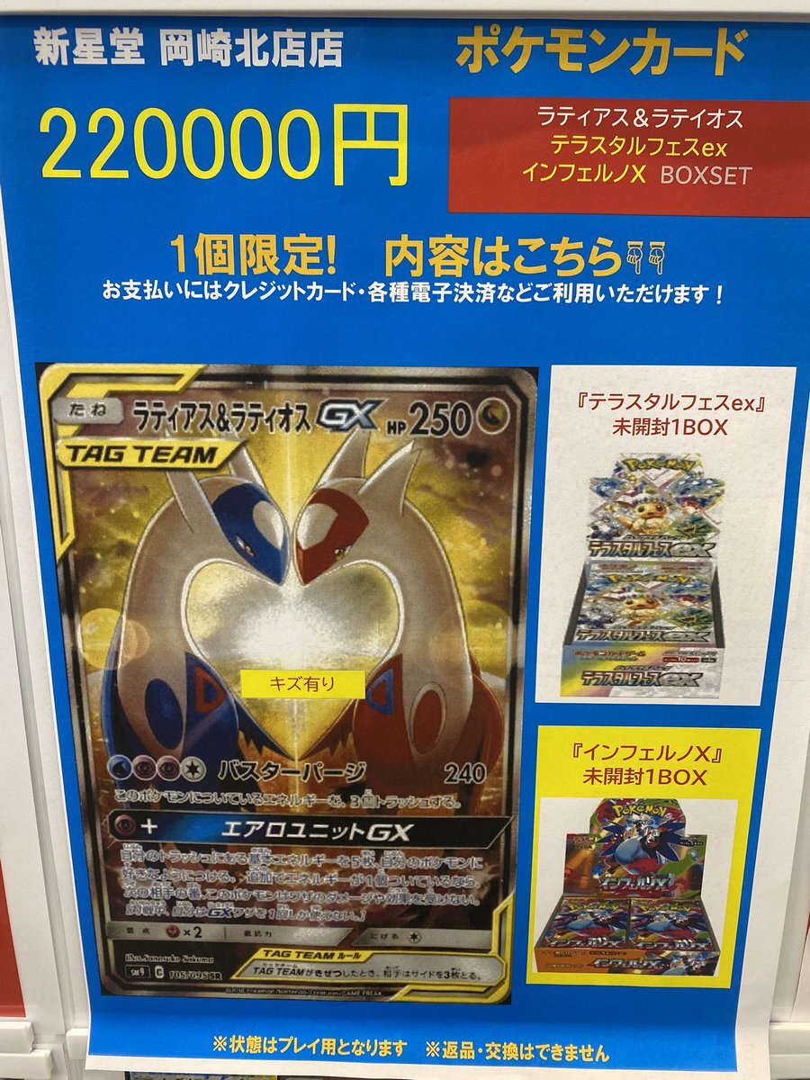 【トレカ情報】 #ポケモンカード 2️⃣2️⃣0️⃣0️⃣0️⃣0️⃣円 1個限定❣️❣️ 『ラティアス&ラティオスGX』 ポケカ民が認める ⭐️⭐️神イラスト⭐️⭐️ BOX⇒テラスタルフェスex インフェルノX 勿論、カードの状態確認 出来ます! 皆様のご来店、お待ちして おります。 #新星堂アピタ岡崎北店 pic.x.com/khGYLJS0rW