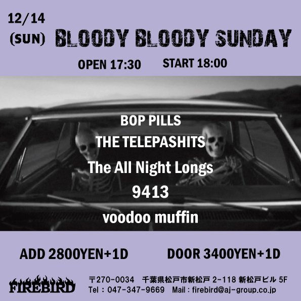 Rollが好きならおいでよ☠ FIREBIRD presents “bloody bloody sunday” 2025/12/14(日) open 17:30 start 18:00 前売 ¥2.800+1d 当日 ¥3.400+1d band name ・voodoo muffin ・THE TELEPASHITS ・BOP PILLS ・9413 ・The All Night Longs drink or die!! #新松戸firebird pic.x.com/V0pC7IWB0M