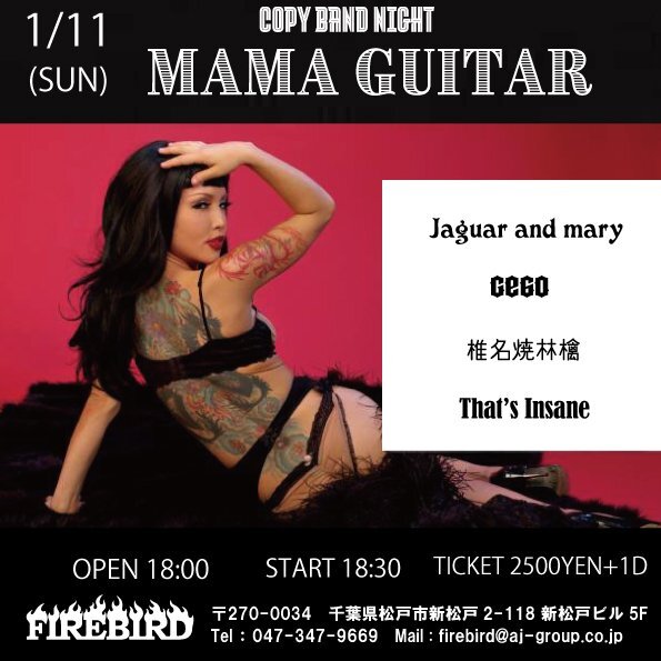 コピバンイベント 1/11(日)「MAMA GUITAR」 今回は、SHOW-YA、浜田麻里、 X JAPAN、アン・ルイス、椎名林檎 THE YELLOW MONKEY レミオロメン、エレファントカサマシ、東京事変、Vaundy JUN SKY WALKER(S) 他のコピーカバーナイトです🎶 #新松戸firebird pic.x.com/0tS8p5WwXX