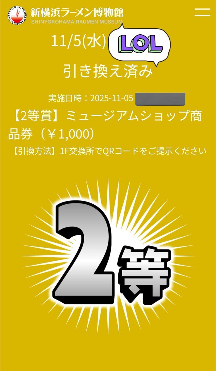 ラー博の日 てくてくお散歩がてらきた〜!!! 豚骨が苦手なのでラー博の日のラーメンは食べられない(泣) いつもの龍上海で!!!!!! ヒャッハー!!!! 久しぶりに🎉2等 #新横浜ラーメン博物館 #ラー博 #ラー博の日 pic.x.com/BHsavr6hER
