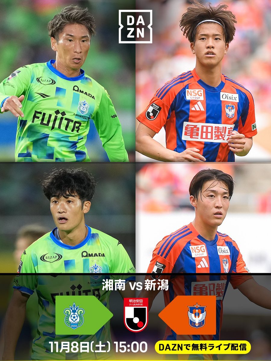 注目のJ1無料ライブ配信🆓 19位湘南🆚20位新潟 湘南は19試合未勝利、 新潟は16戦未勝利ですでに降格決定、 ともに来季J2での戦いが決まった2チームだが 悔しさの中でも最後まで意地を見せたい💪 🏆明治安田J1第36節 🆚湘南×新潟 解説:松原良香 📅11/8(土)15:00 📱#DAZN 無料ライブ配信