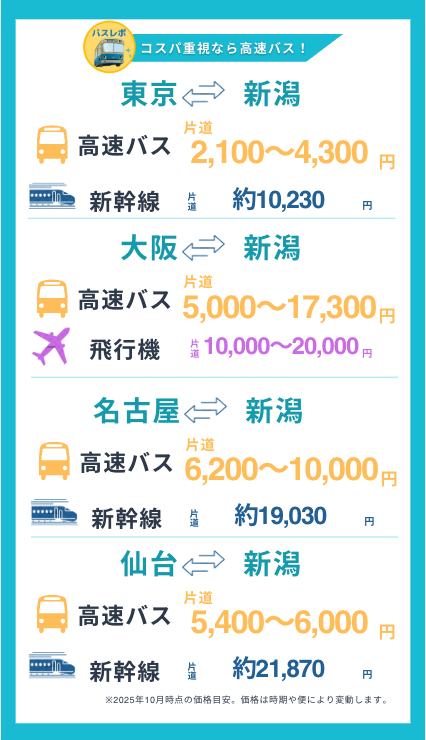【最終確認】そのルート、本当に最安? 主要都市→新潟の交通費まとめ 💡上級者TIPS 新潟駅からは「路線バス・レンタサイクル・えちごトキめき鉄道」で観光地を効率よく回るのがコツ。 特に港町・古町エリアはバス1日乗車券が最強! #新潟旅行 #節約旅 #高速バス pic.x.com/Vje50Nt2yR
