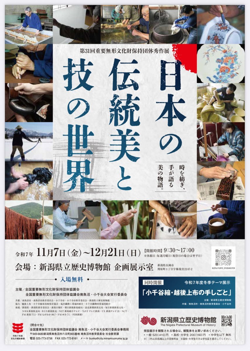 【日本の伝統美と技の世界】観覧無料 第31回 重要無形文化財保持団体秀作展「日本の伝統美と技の世界」12/21まで開催。輪島塗など全国の16の重要無形文化財保持団体の作品を紹介。実演もあります! nbz.or.jp/?p=34303 冬季テーマ展示「小千谷縮・越後上布の手しごと」も併設 #新潟県立歴史博物館 pic.x.com/GOIhlzwFQj