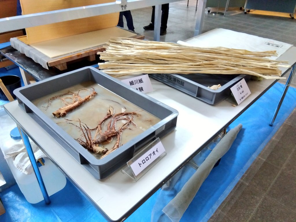 【日本の伝統美と技の世界】 和紙を作るときの材料について説明中 水と繊維とトロトロ!? トロロアオイがとろとろしててびっくり! オクラの仲間なんだって〜 見にきてねえ #細川紙 #重要無形文化財 #新潟県立歴史博物館 #紙漉き #和紙 #伝統 #伝統美 # #白皮楮 #トロロアオイ pic.x.com/wIDlMcz4sN