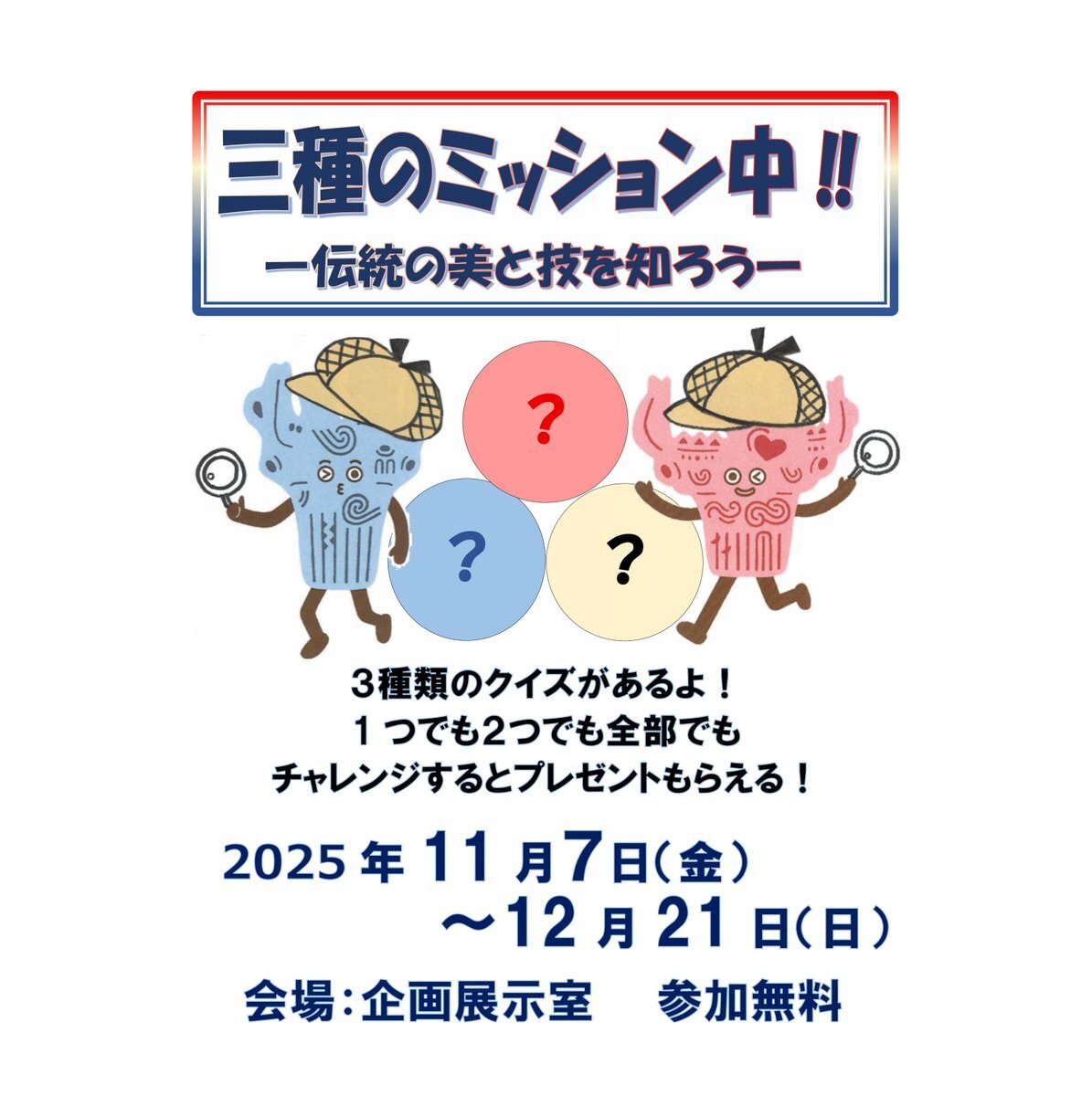 【三種のミッション中!!―伝統の美と技を知ろう―」】 無料 「日本の伝統美と技の世界」に関する三種類のクイズにチャレンジしながら、日本の伝統的な工芸技術や作品について楽しく学べちゃう! 参加者にプレゼントあり&三種類すべてに挑戦した方はコンプリートセットプレゼント♡ #新潟県立歴史博物館 pic.x.com/XadfPs7DGi