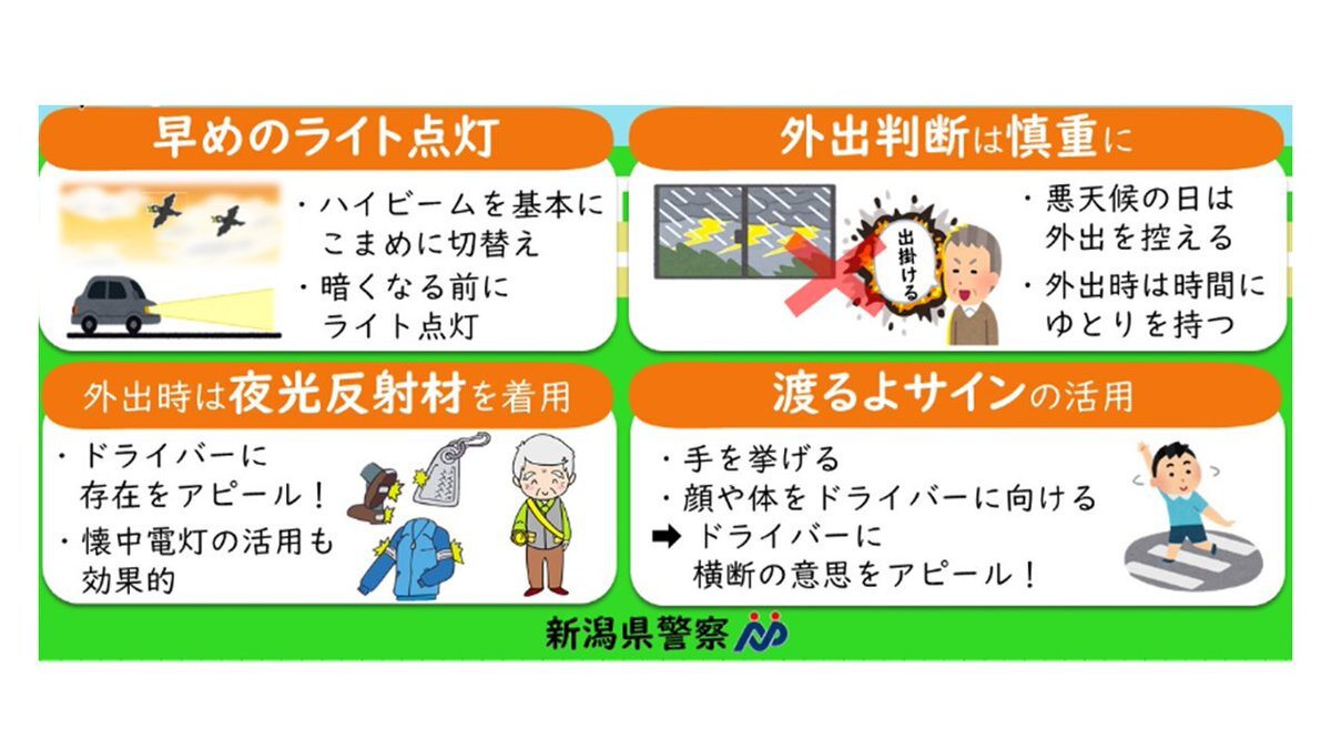 年末まで「交通死亡事故ゼロ」で 楽しく過ごしましょう! 例年 ・夕方から夜間にかかる時間帯の事故 ・高齢者の方が関わる事故 が増加する傾向があります。 「事故にあわない」「事故をおこさない」ために 交通事故防止のポイントを実践しましょう✨ #新潟県警 #交通事故防止 pic.x.com/qCNP767i2j
