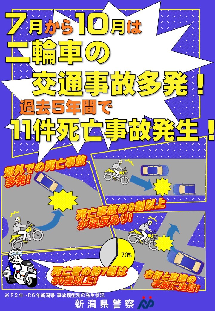 【⚠交通死亡事故シャットアウト緊急対策実施中⚠】 10月17日から21日までに5件の #交通死亡事故 が連続発生し、緊急対策を実施しています。 バイク運転手の皆さん ・9,10月の2か月間で二輪車の交通死亡事故が3件発生 ・スピードの出しすぎや無茶な右左折は厳禁⚠ #新潟県警 pic.x.com/sabsAAobPc