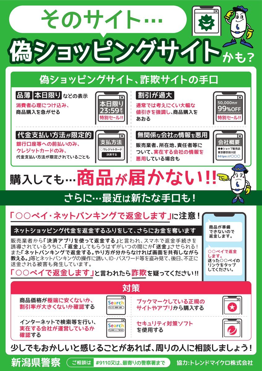 被害相談多数!偽ショッピングサイトに要注意! 「激安・在庫あり」と探していた商品をインターネットで見つけて「お得かも」と感じた時こそ、詐欺に注意しましょう。怪しいと思ったら購入前に必ず相談をお願いします。 #新潟県警 #偽ショッピングサイト #お得 #激安 #在庫あり #セール #SALE pic.x.com/fePhDDnwGH