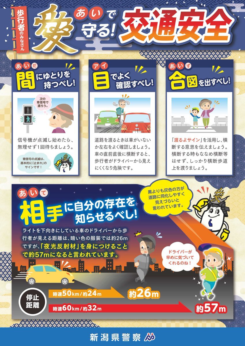 【⚠交通死亡事故シャットアウト緊急対策実施中⚠】 10月17日から21日までに5件の #交通死亡事故 が連続発生し、緊急対策を実施しています。 歩行者の皆さん ・夜間は夜光反射材を着用し、自らの存在をアピール!! youtube.com/watch?v=5wJSt5… #新潟県警 pic.x.com/8mEkbNkEGg