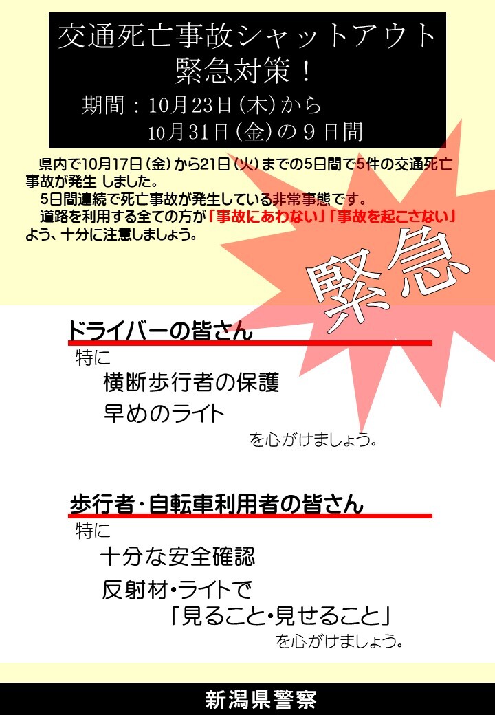 【⚠交通死亡事故シャットアウト緊急対策実施中⚠】 10月17日から21日までに5件の #交通死亡事故 が連続発生しています。 歩行者のみなさん。 道路を渡る時は、車がいないか左右をよく確認しましょう。 横断する時は斜め横断などはせず、しっかり横断歩道を渡りましょう! #新潟県警 pic.x.com/wYUo4KBAeY
