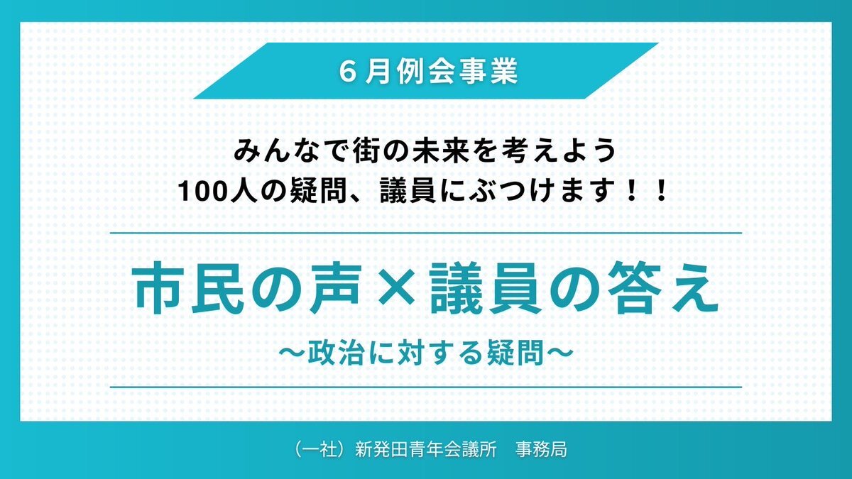 6月例会 〜みんなで街の未来を考えよう!100人の疑問、議員にぶつけます〜 にて参加していただいた市民の皆様からの地域や政治への質問の回答をいただきました。 是非ご覧ください😊 #新潟 #新発田 #新発田青年会議所 # #地域 #政治 #明るい #未来 pic.x.com/XaoOfKmYcq