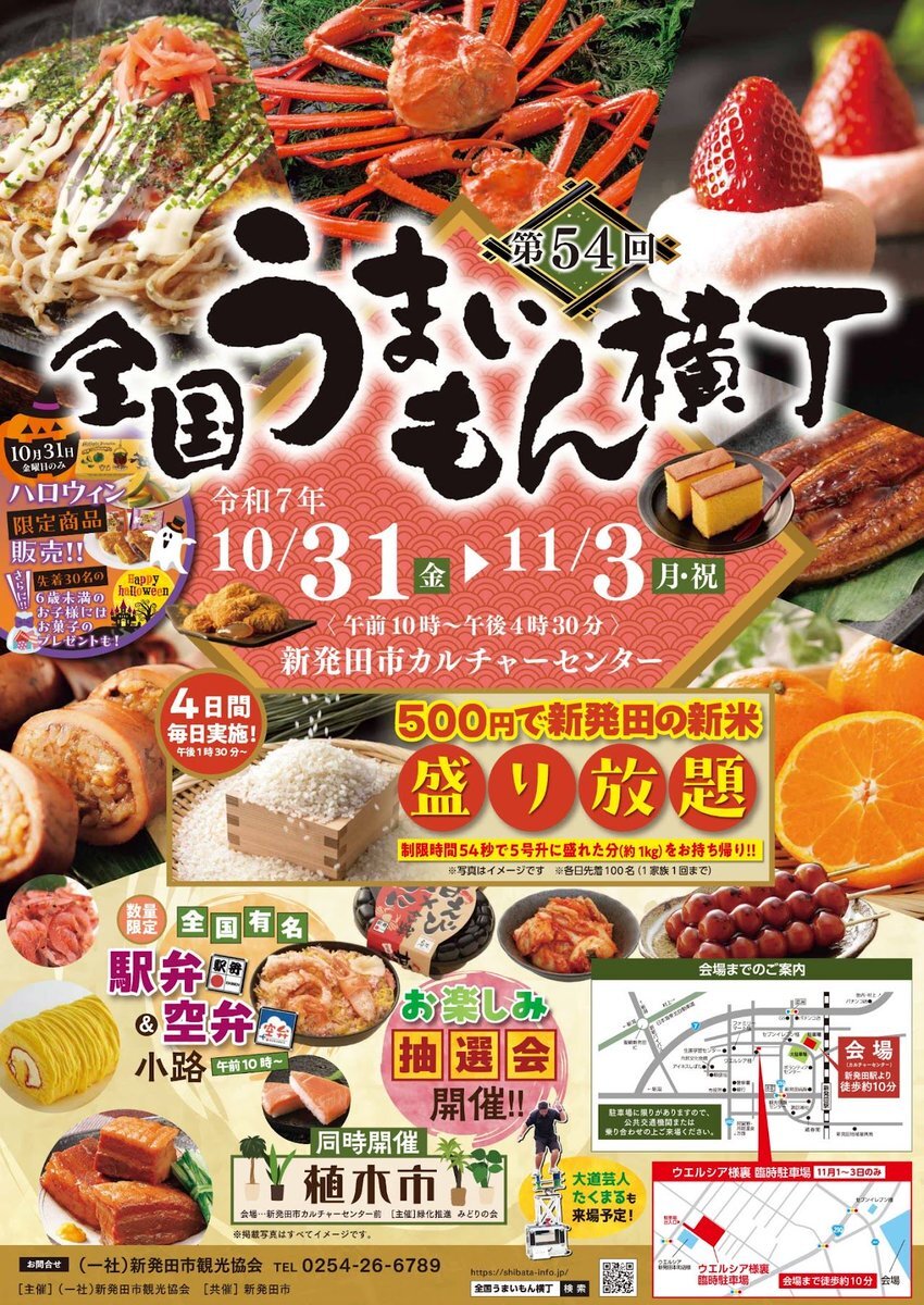10月31日〜11月3日まで全国の名産品「うまいもん」が集まる物産販売展です‼️ 食べておいしい「美味いもん」のほか、匠の技が光る「巧いもん」も集合🔥🏅 今年も100店舗以上が出店予定です! #新発田市 #観光協会 #新発田青年会議所 #jci #新潟 #おでかけ #観光 #イベント #グルメ #全国うまいもん横丁 pic.x.com/TxrZINVBkR