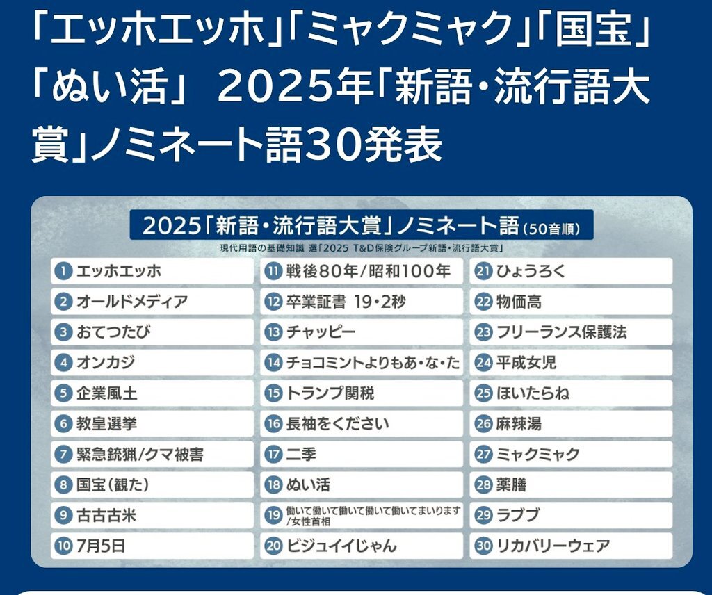 【速報】現代用語の基礎知識 選「2025 T&D保険グループ新語・流行語大賞」ノミネート30語発表 news.livedoor.com/article/detail… 1. エッホエッホ 2. オールドメディア 3. おてつたび 4. オンカジ 5. 企業⾵⼟ 6. 教皇選挙 7. 緊急銃猟/クマ被害 8. 国宝(観た) 9. 古古古⽶ 10. 7⽉5⽇ 11. 戦後 80
