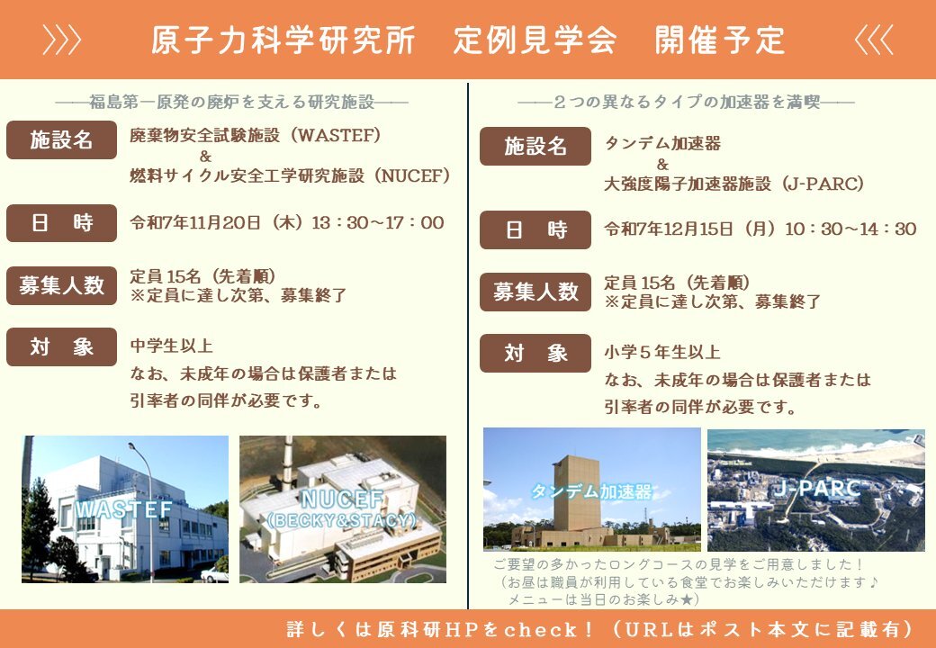 #原子力科学研究所 見学会のご案内】 普段は入れない研究施設を公開✨ 11/20(木)は廃炉を支える研究施設WASTEF・NUCEFを、12/15(月)は加速器施設のタンデム加速器・J-PARCを見学できます! ぜひご参加ください🌟 詳細・申込はこちら👇 jaea.go.jp/04/ntokai/cont… #施設見学 #加速器 #科学 #研究 pic.x.com/31QiMlZPuN