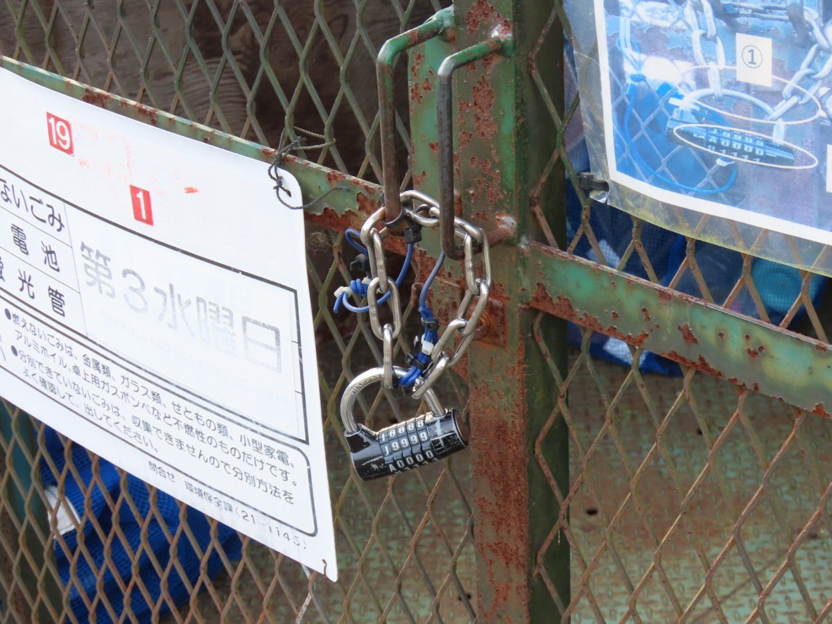 里山の峠に向かう道すがら 隣地区の #ゴミ集積所 車道脇だからか通りすがりの人のゴミ捨て排除の為 #施錠 ダイヤル錠 うちの地区は無施錠 先日組長が 間違った分別のゴミ捨てが目に付けば施錠もやむ無しと‐(先日 容器包装ゴミ回収袋にペットボトルが多量に捨てられていた事などから←余所者だろうと) pic.x.com/VTCBB9BSqu