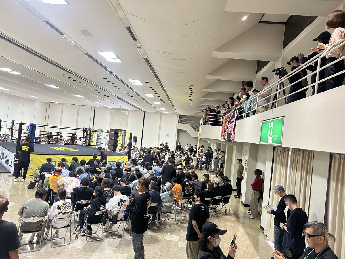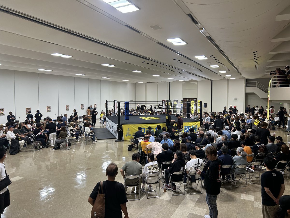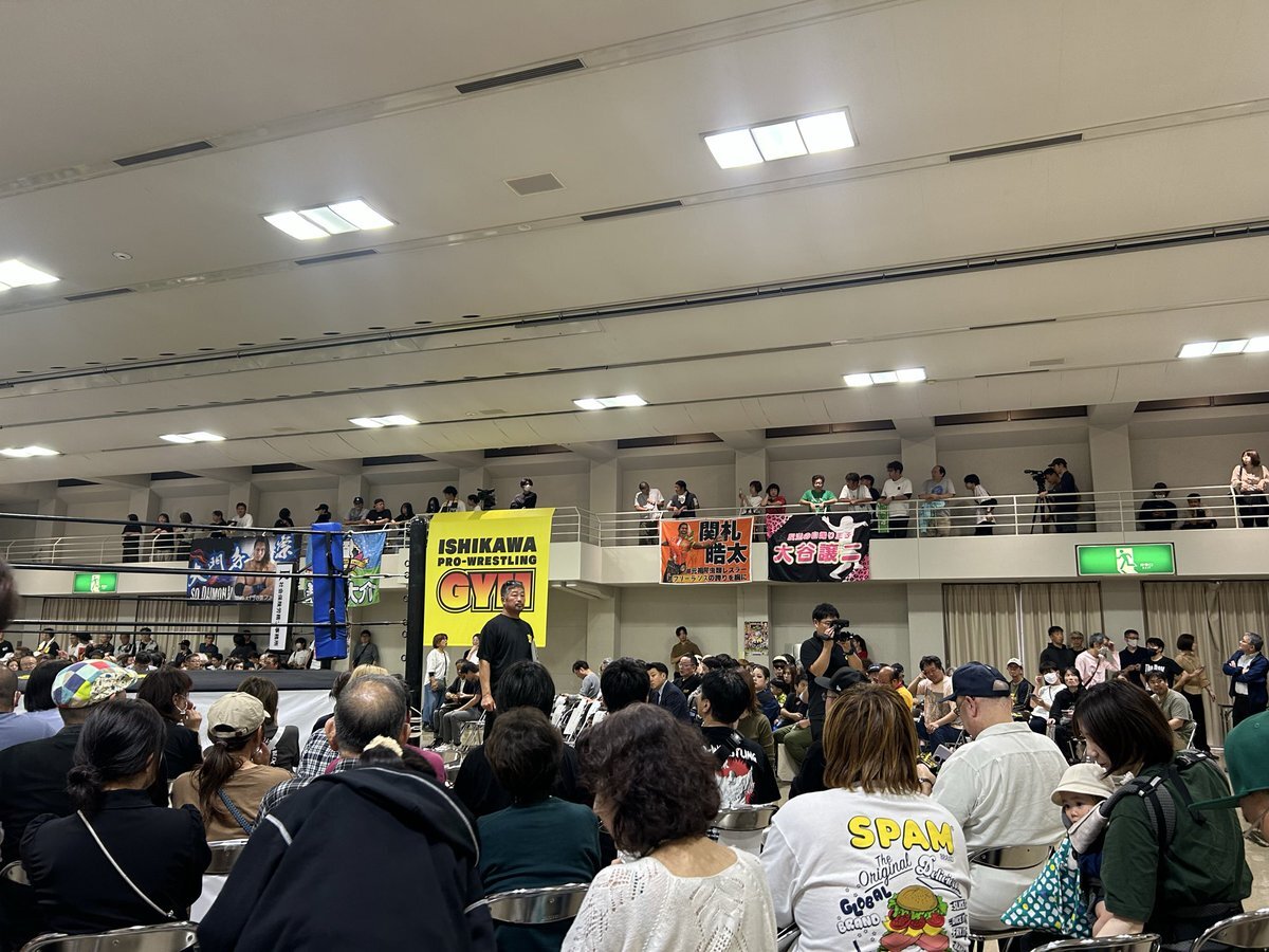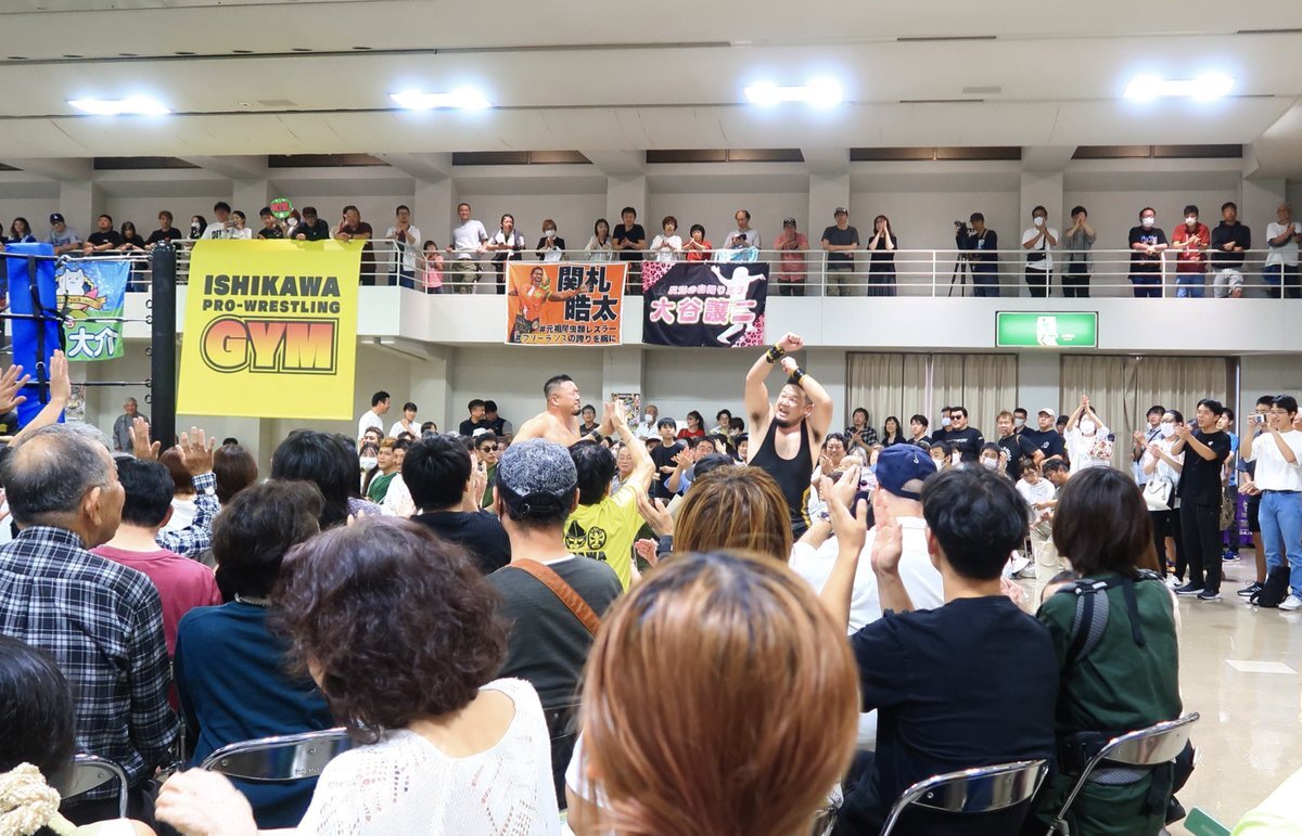 昨日は石川プロレスの旗揚げ戦!金沢流通会館大会に行ってきました。 用意した席は軽々埋まり、、 立ち見&2階テラスまでのお客さんがギッシリの超満員。 熱気ムンムン!こんなにも期待感が溢れ出る興行を体験するのは久しぶり♪ そんな中で和氣兄弟のデビュー戦だ!😊 #石川プロレス #旗揚げ戦 pic.x.com/l296zy7Q9J