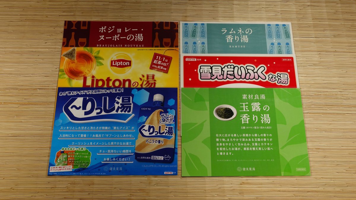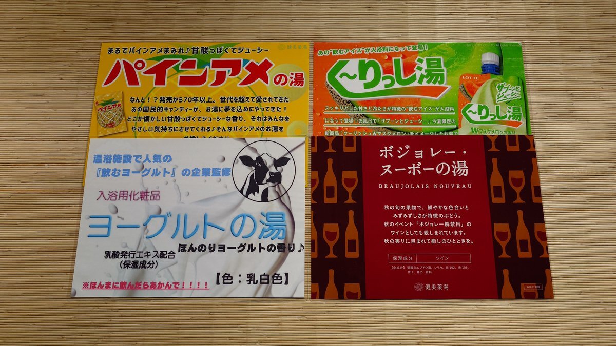 ども❗️#日の本湯 です 今週の薬湯のラインナップはこちら‼️ 月曜日 #ラムネ 火曜日 #雪見だいふく 水曜日 #玉露 木曜日 #ボジョレーヌーボー 土曜日 #Lipton 日曜日 #クーリッシュ バニラ 今週ボジョレーが解禁となるのでお楽しみに‼️ ご来湯お待ちしております🙇‍♂️ #銭湯 #サウナ #守口市 #入浴剤 pic.x.com/g7wf21MOLn