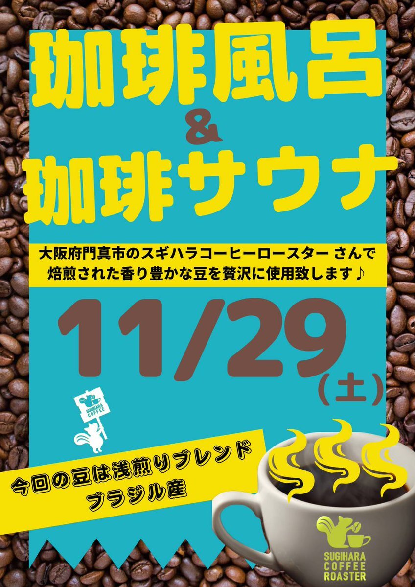 ども❗️#日の本湯 です 今日は大人気イベント湯 #珈琲風呂 #珈琲サウナ やっておりまっせ〜♨️ #スギハラコーヒーロースター さんが焙煎した香り良き浅煎りの豆を贅沢に使用してますよ 今日は #親子ふれあいデイ も実施してるので、ご来湯お待ちしております🙇‍♂️ #銭湯 #珈琲 #サウナ #リス狩り #守口市 pic.x.com/iQXpGC1Yp8
