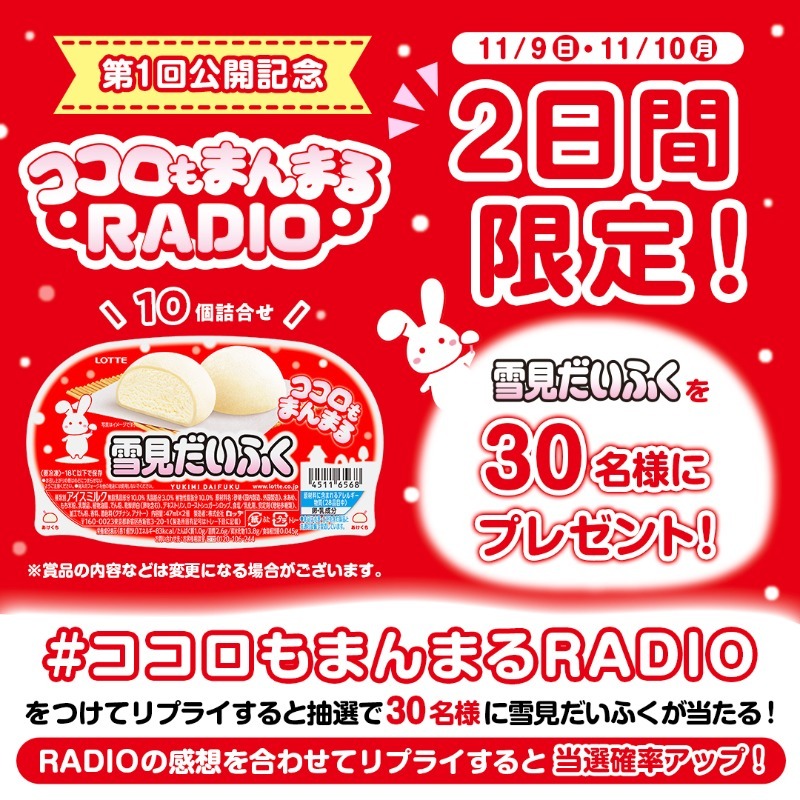 2日間限定プレゼントキャンペーン! #雪見だいふく 10個詰合せを抽選で30名様に🎁✨ 応募方法 ①@yukimi_lotteをフォロー ②この投稿に【#ココロもまんまるRADIO】をつけてリプライ さらに、RADIOの感想を合わせてリプライすると当選確率アップ🐰 RADIOはこちら🎧 youtu.be/EsT_chiXOwU